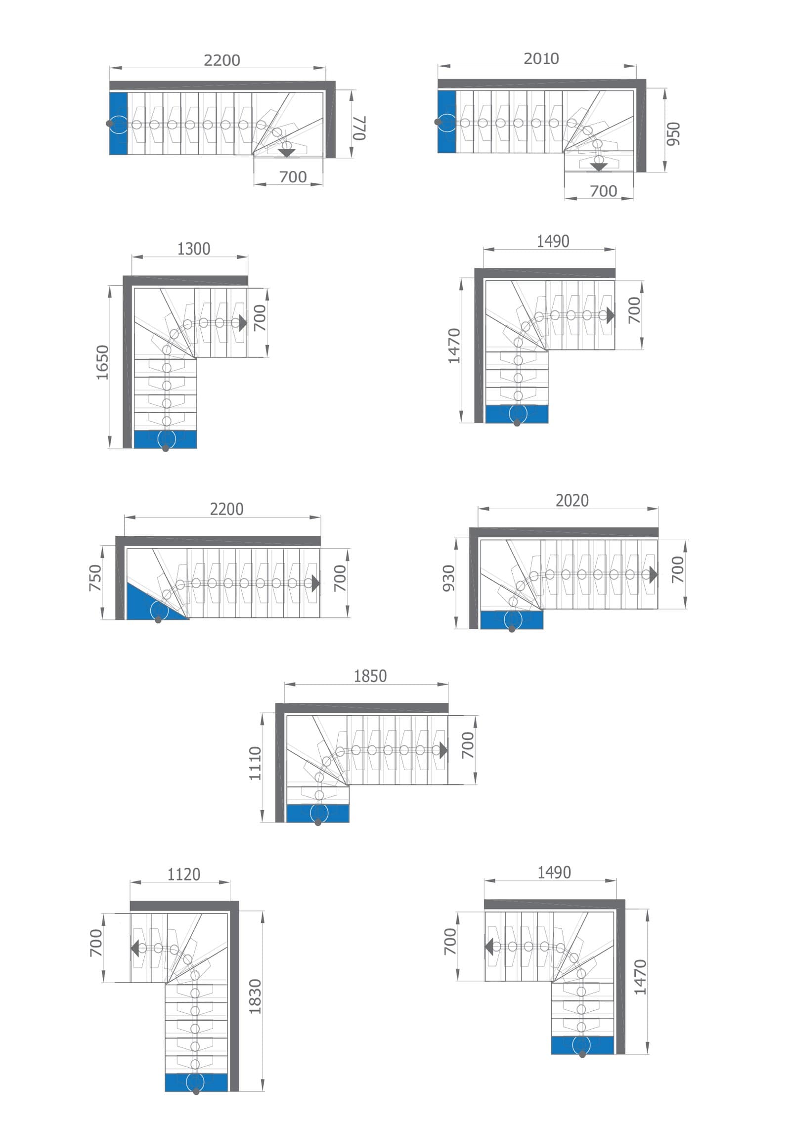 | H – laiptų aukštis (9 pakopos) | 185–250 cm |